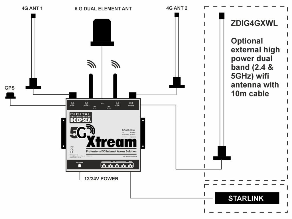 5G Xtream beschikt over dual-band WiFi (2,4 en 5 GHz) verbindingen, zodat gebruikers aan boord eenvoudig het beveiligde wifipunt kunnen zoeken en verbinden. Daarnaast zijn er 4 x LAN-poorten (10/100/1000 Mbit/s) voor bekabelde apparaten zoals smart-tv’s en 1 x WAN-poort die is geoptimaliseerd voor Starlink-satellietconnectiviteit, zodat de 5G Xtream kan optreden als een geavanceerde en snelle router voor al het internetverkeer aan boord.