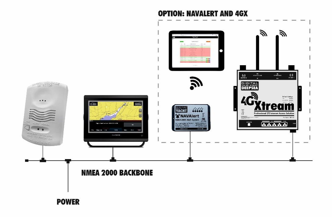 Het systeem kan verder worden uitgebreid met onze NavAlert (universeel NMEA 2000 alarm- en bewakingsapparaat) en onze 4G/5G Xtream internet systemen. In combinatie kan er bij CO Alert een SMS naar een telefoon op afstand worden gestuurd.