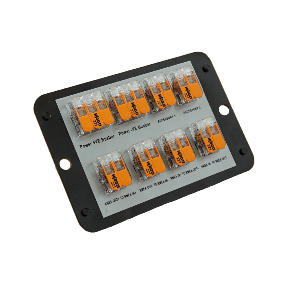 • Geleverd met 2× 3-weg Wago junction blocks (aanbevolen voor plus en min voeding) en 6× 2-weg (aanbevolen voor NMEA)